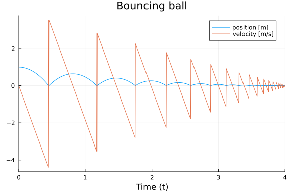 plot(sol,xaxis = "Time (t)", title="Bouncing ball",label = ["position [m]" "velocity [m/s]"])